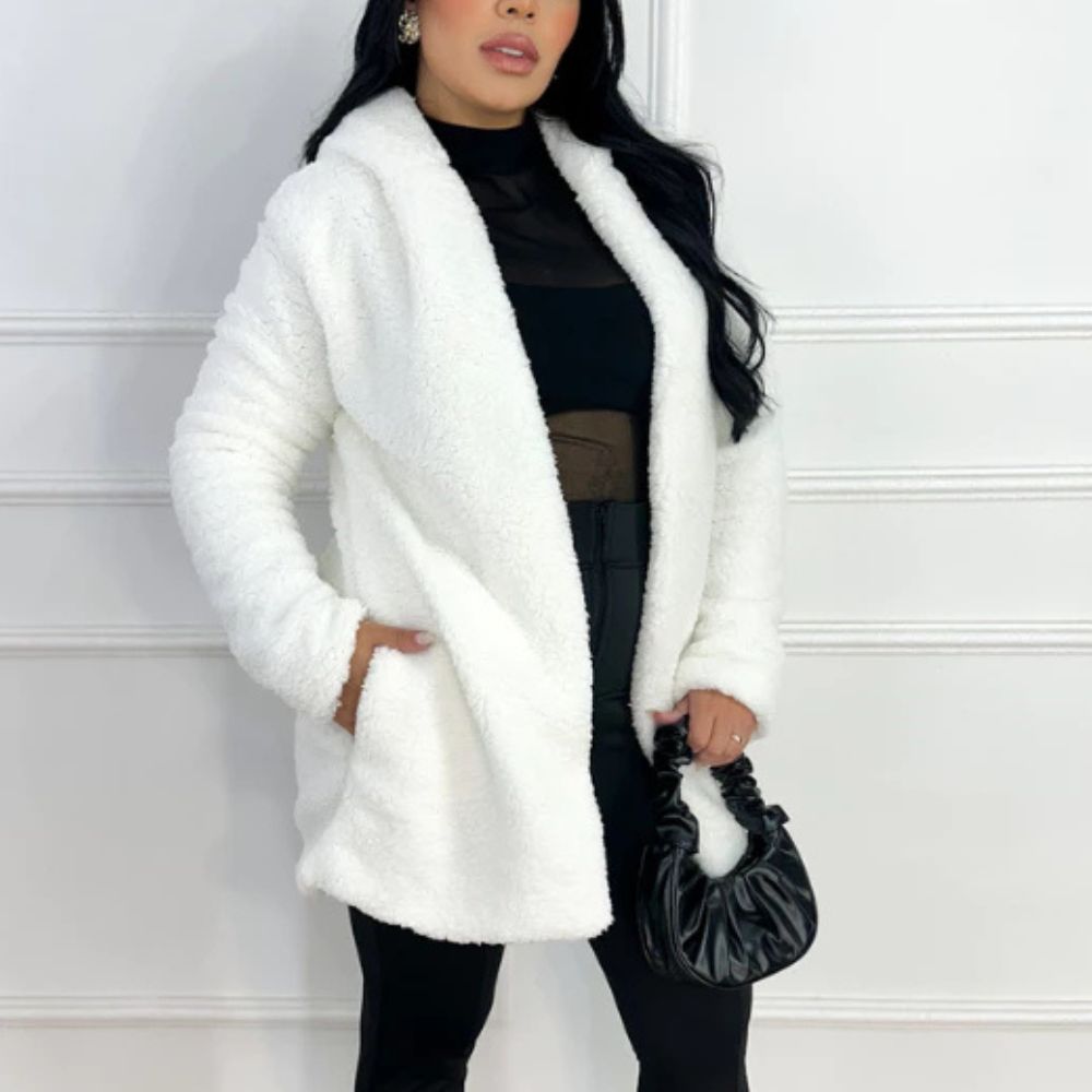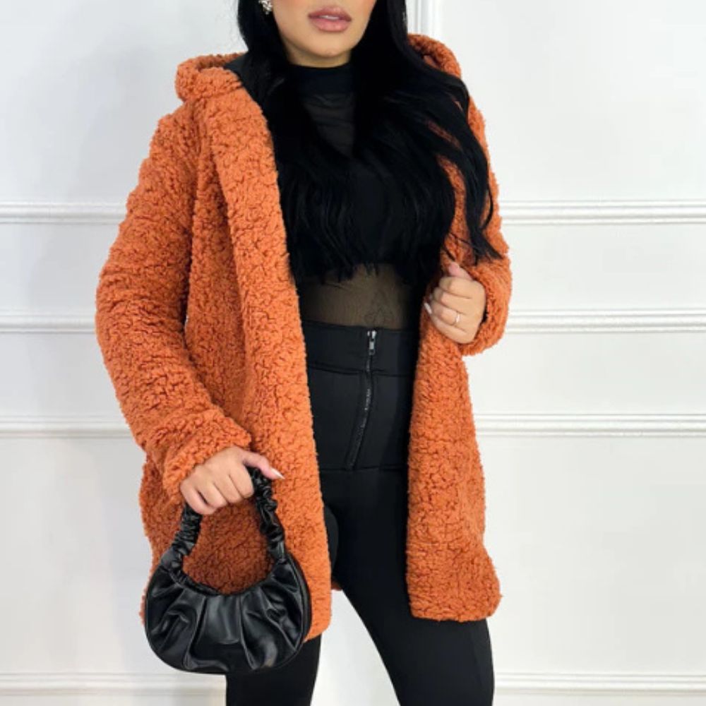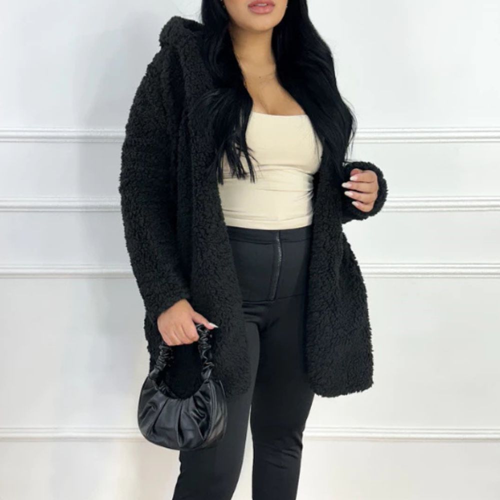 O Casaco Feminino Teddy Longo com Capuz e Forro Peluciado é ideal para quem deseja encarar o inverno com sofisticação e aconchego.
